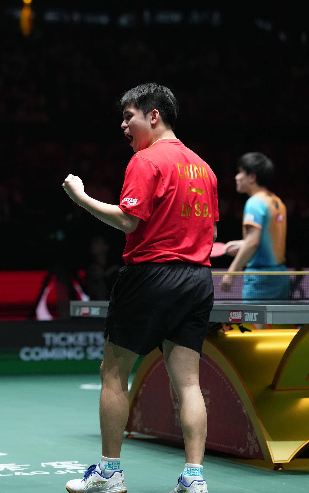 关键的第三盘男单比赛,中国队派出林诗栋对阵日本名将张本智和。此前两人的国际赛场交手记录中,林诗栋以1胜5负处于下风。首局比赛,林诗栋以6比11告负。但他及时调整,在第二局和第三局分别以11比5和11比6连胜两局,逆转取胜。随着林诗栋拿下制胜一分,中国队以总比分8比1锁定胜局,成功卫冕。