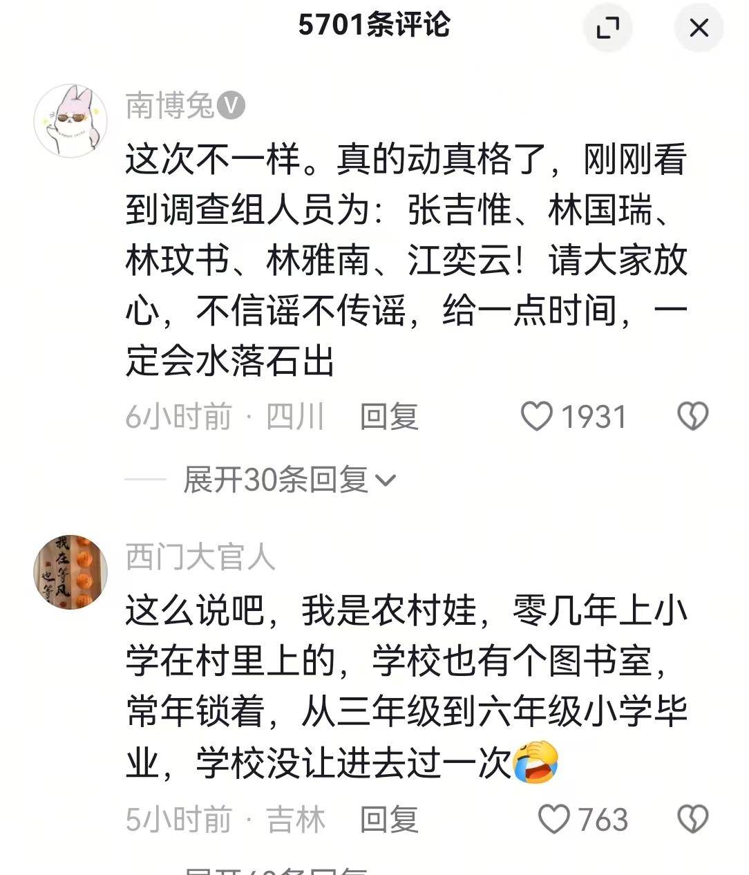 这一次不一样,真的动真格了,刚刚看到调查组人员为,张吉惟、林国瑞、林玟书、林雅南、江奕云!请大家放心,不信谣不传谣,给一点时间,一定会水落石出。