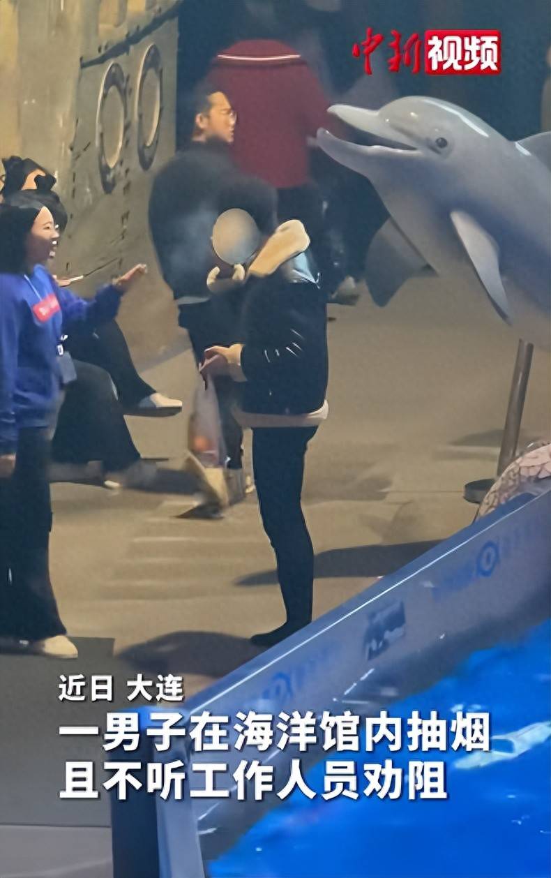 近日,大连一男子海洋馆内抽烟且不听劝阻,白鲸直接从其背后喷水,把男子浇了个透。