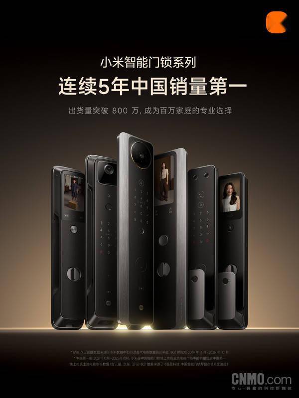 CNMO注意到,根据市场研究机构洛图科技(RUNTO)发布的多份市场报告,2025年上半年,小米在中国智能门锁市场的全渠道出货量位居第一,市场份额超过20%;2025年618大促期间,小米智能门锁位居线上全渠道销量第一;2025年第三季度,小米智能门锁蝉联线上全渠道销量榜首,市场份额为18.0%,从全渠道销售情况来看,小米、德施曼、凯迪仕、华为、萤石、海尔六大品牌出货总量接近400万套,合计市场份额超过40%。