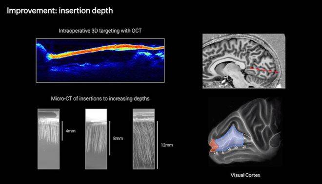 现在的电极只进入4mm的皮层区,足以让患者靠意念移动鼠标、操控机械臂,但如果想恢复视觉,就必须深入到视觉皮层的更深层。