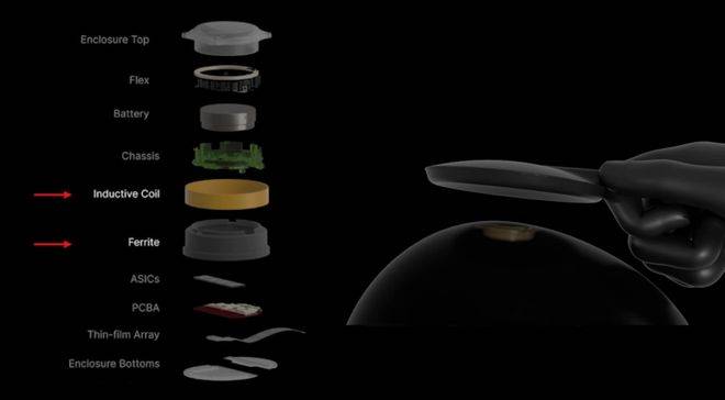 Neuralink植入体的分层结构:包括电池、ASIC芯片、柔性电极阵列,以及用于体外无线充电的感应线圈与铁氧体结构。整个装置最终嵌入头骨内,与皮肤齐平,无需外露。