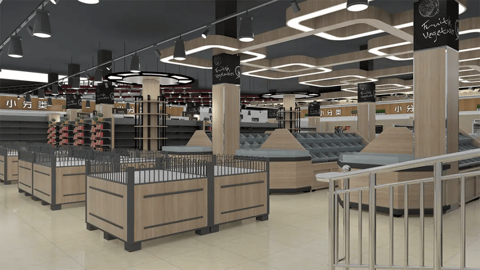 - 生鲜区:水产区做玻璃隔断+防滑地面,蔬果区设货架预埋件,熟食区安装排烟管道(需接室外)。