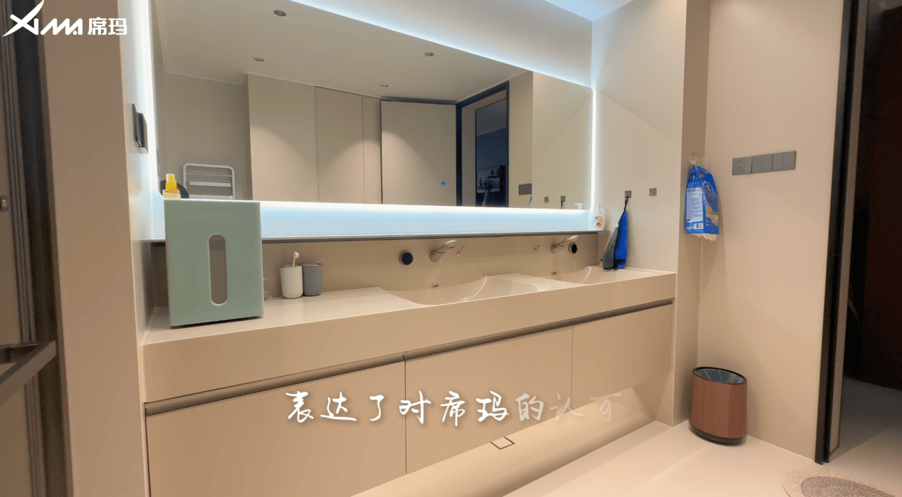 当看到席玛卫浴采用的玉晶石台面时,黎女士当即觉得 “找对了”。席玛的玉晶石台面是一体成型的工艺,既能轻松实现 2.6 米的超大尺寸需求,又能做到无缝衔接,完美规避了岩板拼接的弊端,其温润的质感与微水泥墙面的奶油光感也能形成巧妙呼应,与整个新家的中古风氛围一拍即合。