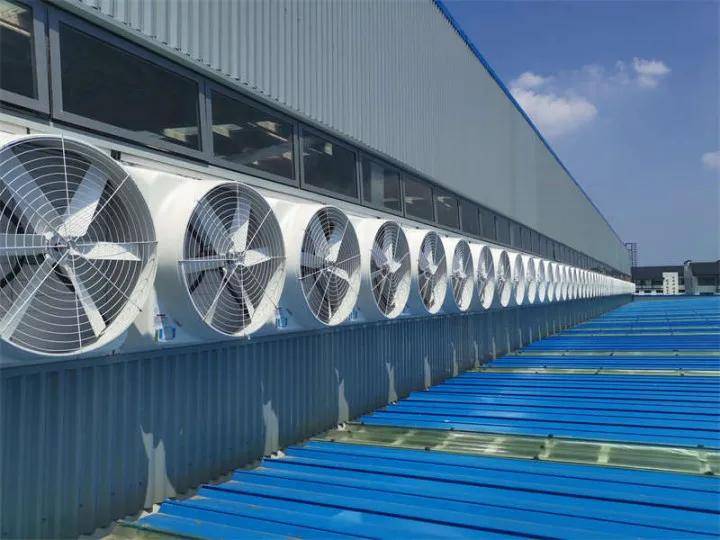 1、安装位置精准选址:优先选厂房上风侧墙面/屋顶,避开障碍物遮挡进出风口,确保空气流通无阻碍;间距控制在8-12米,单台覆盖面积匹配空间大小(常规1.4m风机覆盖150-200㎡),高宽比超1.5的厂房建议墙面+屋顶组合安装,避免通风死角。