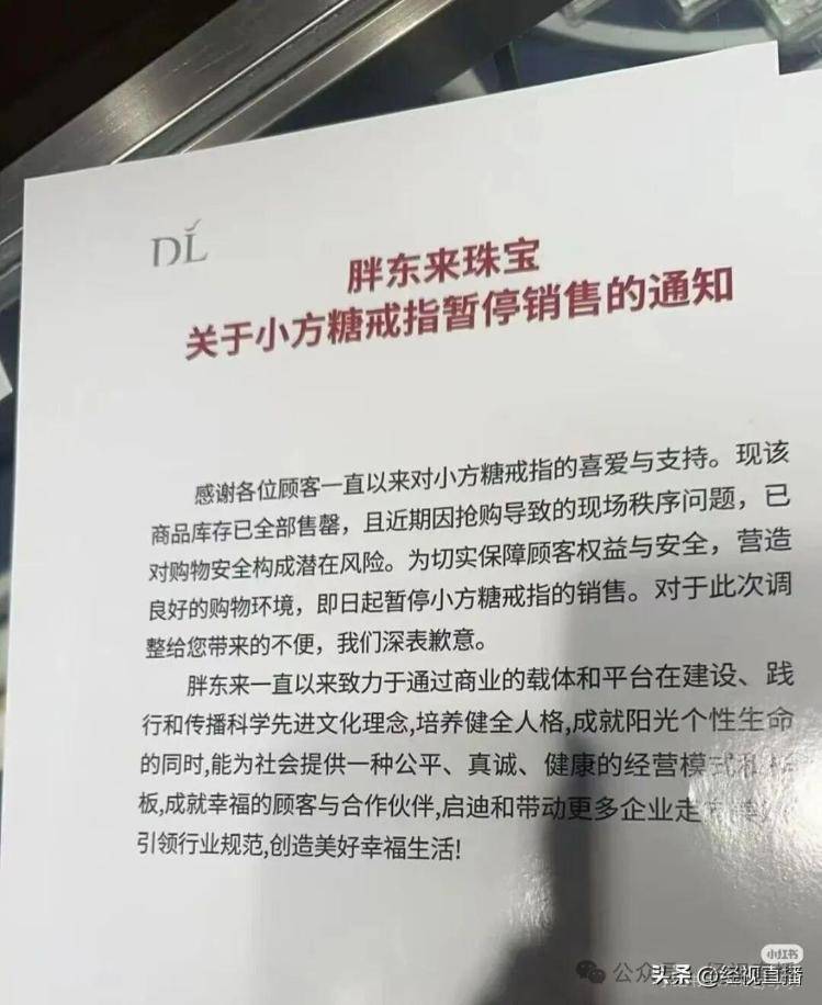 一则网传《胖东来珠宝关于小方糖戒指暂停销售的通知》称,该商品库存已全部售罄,且近期因抢购引发的现场秩序问题对购物安全构成潜在风险,故暂停销售。