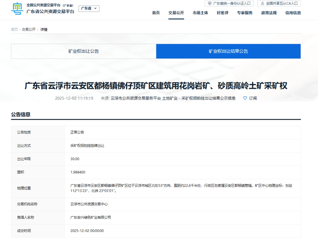 近日,广东云浮市公共资源交易中心成功出让广东省云浮市云安区都杨镇佛仔顶矿区建筑用花岗岩矿、砂质高岭土矿采矿权。该矿资源储量约2.78亿方(其中建筑用花岗岩可采储量2.33亿方),生产规模950万方/年,出让年限30年,广东安兴绿色矿业有限公司最终以底价15亿元竞得。