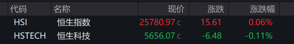 香港恒生指数开盘涨0.06%,报25780.97点;恒生科技指数跌0.11%。中芯国际、华虹半导体、快手等跌超1%。