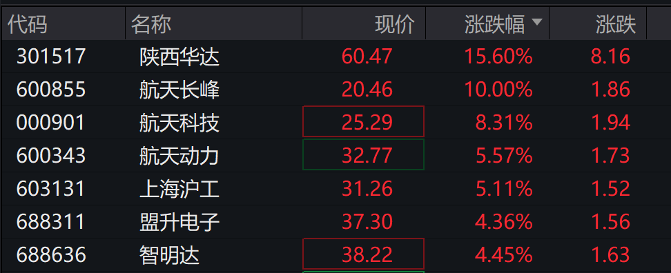 A股商业航天概念继续活跃,龙洲股份5连板,宝胜股份、西部材料3连板,陕西华达涨超10%,达华智能、航天宏图、雷科防务、顺灏股份跟涨。