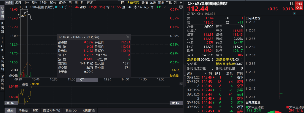 中国30年期国债期货盘中一度上涨0.53%,创11月17日以来最大涨幅,目前涨幅收窄至0.35%。