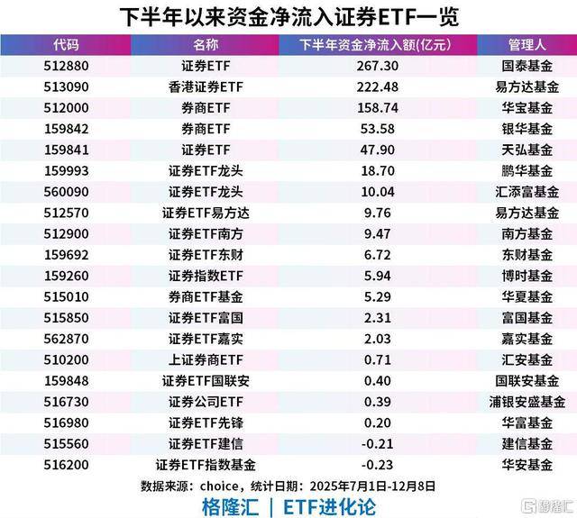 截至12月8日,下半年以来证券ETF吸金超820亿元。其中,证券ETF、香港证券ETF吸金超220亿元;华宝券商ETF吸金158亿元;银华券商ETF、证券ETF吸金超47亿元;鹏华证券ETF龙头、汇添富证券ETF龙头吸金超10亿元。