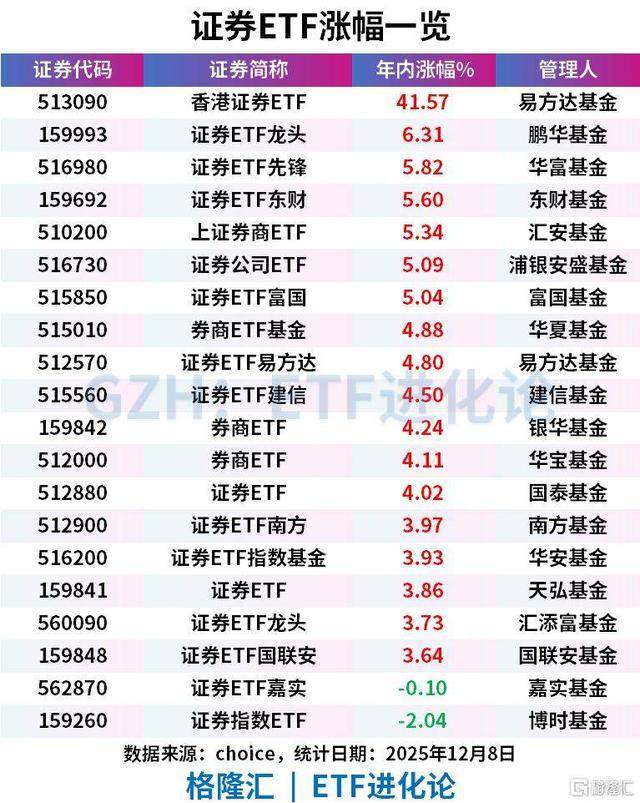 香港证券ETF年内涨超41%,A股证券ETF涨幅在5%。
