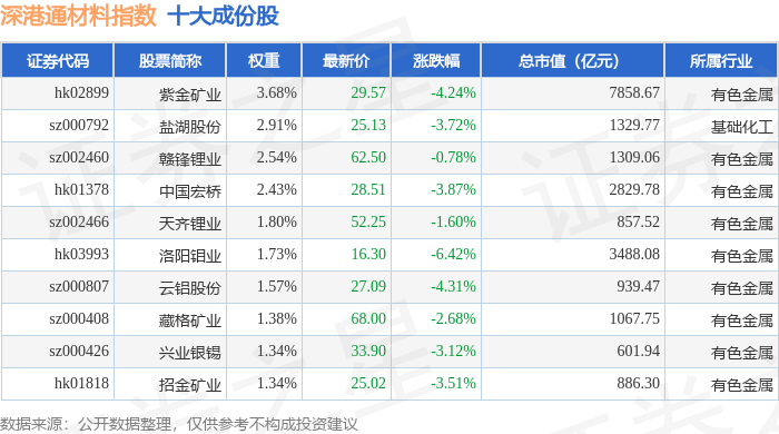 深港通材料(983015)指数十大成份股详情如下: