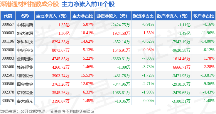 资金流向方面,深港通材料(983015)指数成份股当日主力资金净流出合计56.95亿元,游资资金净流入合计11.85亿元,散户资金净流入合计45.09亿元。成份股资金流向详情见下表: