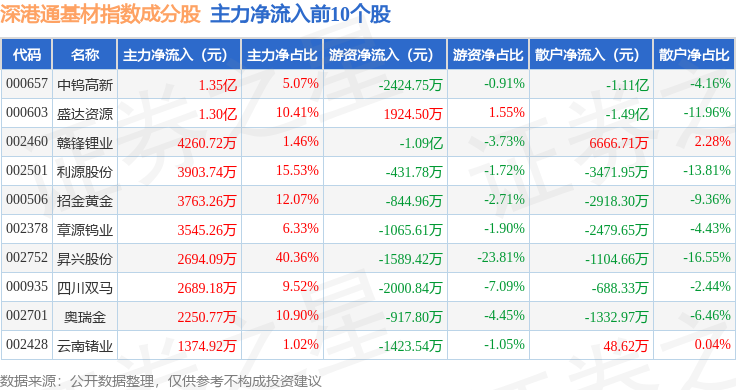 资金流向方面,深港通基材(983061)指数成份股当日主力资金净流出合计39.65亿元,游资资金净流入合计7.06亿元,散户资金净流入合计32.59亿元。成份股资金流向详情见下表: