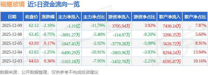 证券之星消息,截至2025年12月9日收盘,福耀玻璃(600660)报收于62.12元,下跌2.1%,换手率0.75%,成交量15.11万手,成交额9.44亿元。