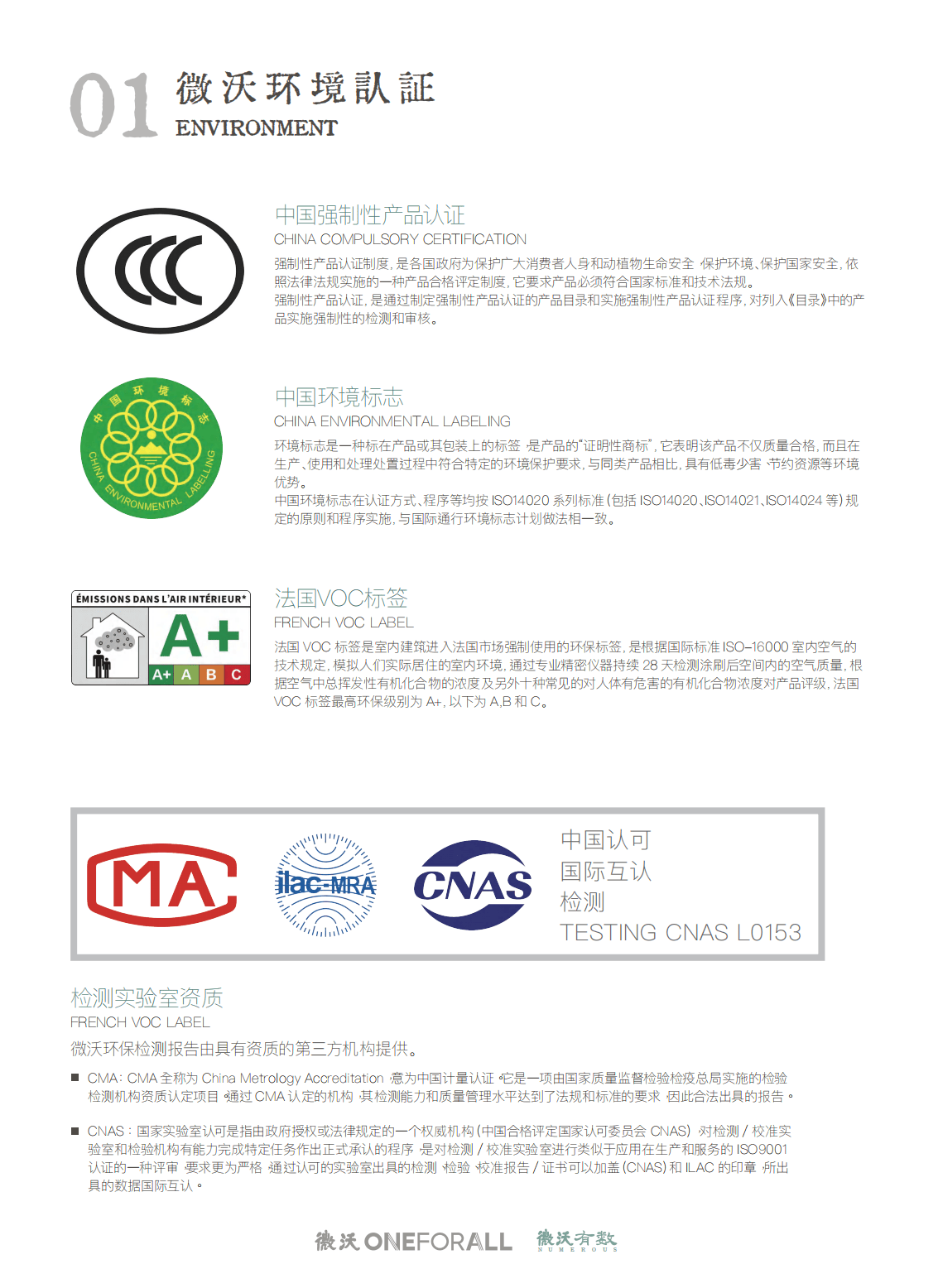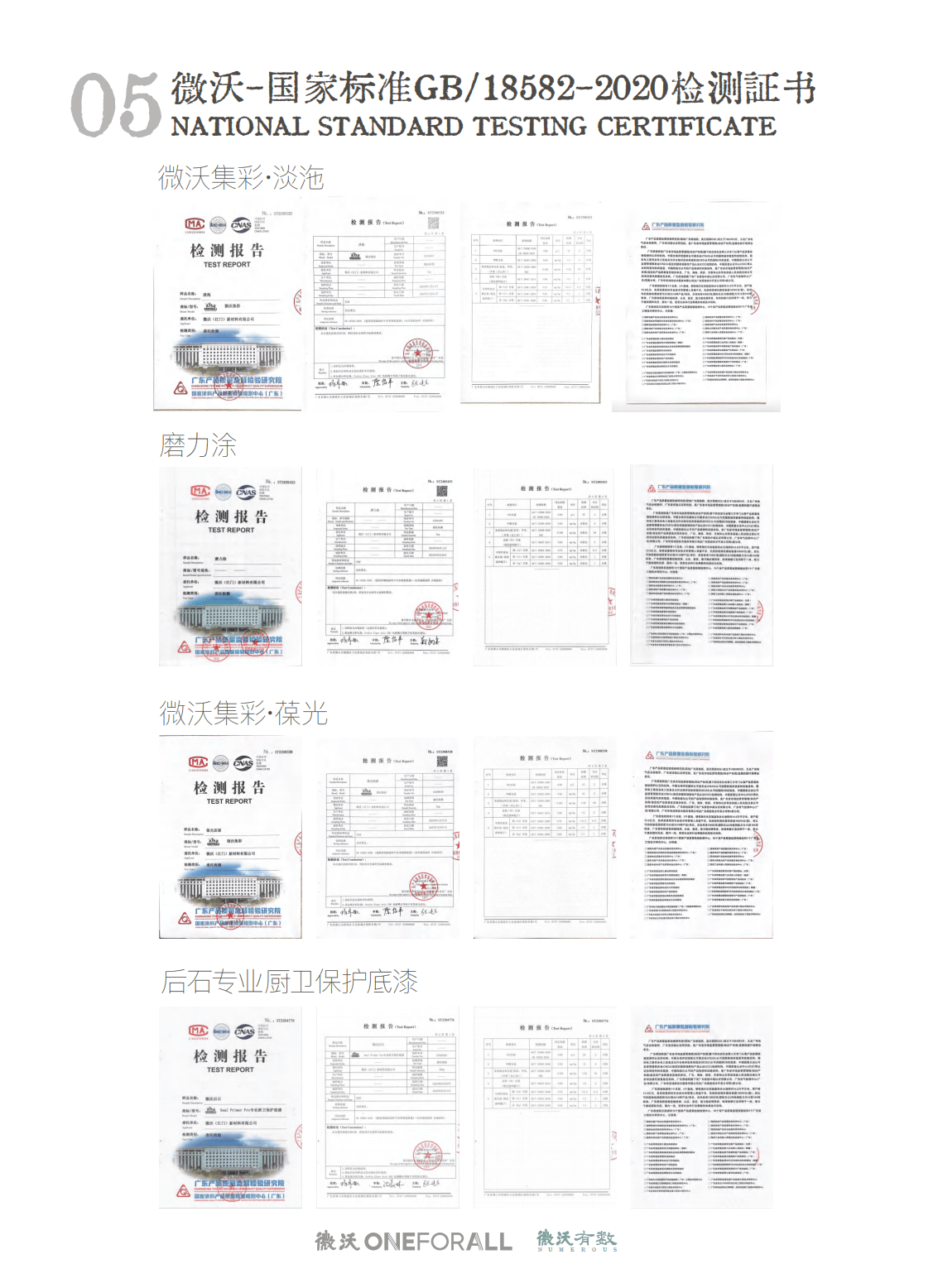 1、微沃全系列产品均通过了最新国标认证的环保检测,甲醛、VOC等有害物质释放量远优于GB 18582-2020最新国家标准的要求,部份产品能达成未检出。