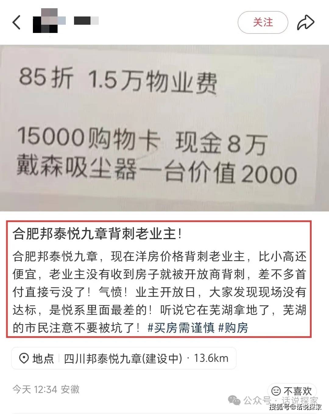 网友吐槽:瑶海区的四川邦泰悦九章背刺老业主,据说是直接85折+1.5万物业费,洋房比小高还便宜,还没收房差不多首付亏没了,此前业主开放日也被曝出不达标…