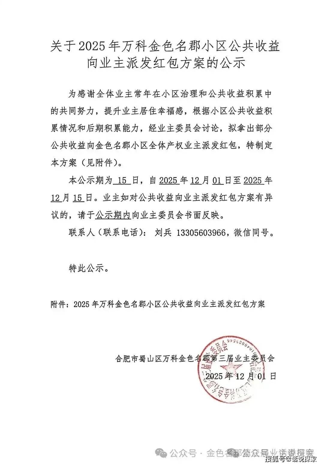 12月1日,该小区小区第三届业主委员会正式公示《2025年万科金色名郡小区公共收益向业主派发红包方案》,拟拿出210万元公共收益,给全体产权业主直接发钱。