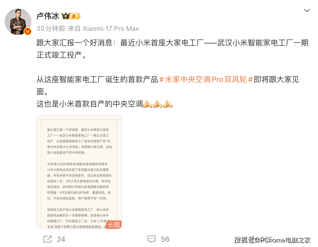 12月11日,小米集团合伙人、总裁,手机部总裁,小米品牌总经理卢伟冰发文称,小米首座大家电工厂——武汉智能家电工厂一期正式竣工投产,首款自研产品“米家中央空调Pro双风轮”同步官宣,这也是小米首款自产中央空调产品。