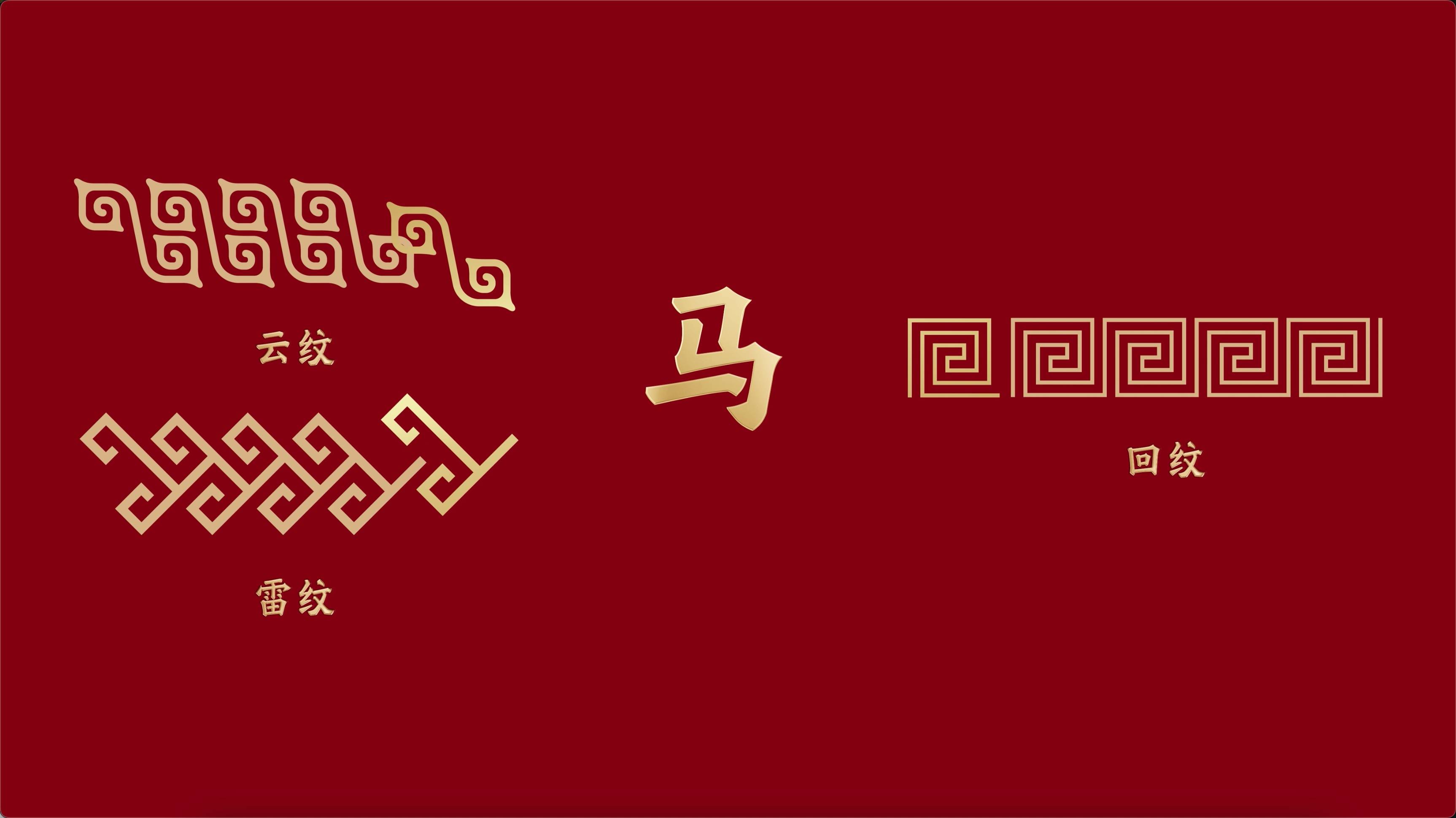 “骐骥驰骋”四个字都是马字旁,又有“奇迹”的谐音。如何表达“创造奇迹”,我想到了“天马行空”,如何传达“天马行空”的意象,我想到了云雷纹。其实,云雷纹早在新石器时期有了,先民们在陶器上用云雷纹表达对天地的敬畏。云雷纹发展到后面是回纹,这两种纹样都是连环的形状。