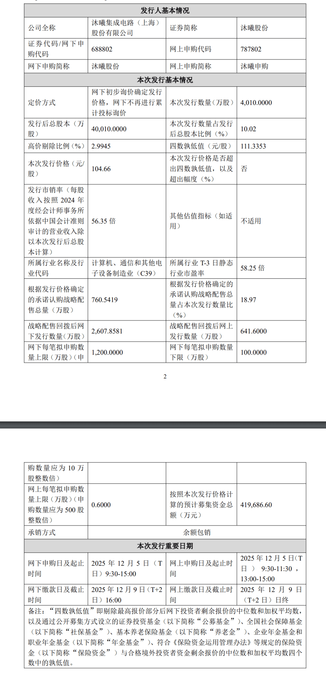 12月3日晚间,国内GPU龙头沐曦股份发布首次公开发行股票并在科创板上市发行公告,发行人与保荐人(主承销商)根据网下发行询价报价情况,协商确定本次发行价格为104.66元/股。