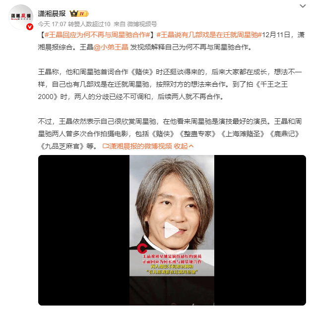 12月11日,潇湘晨报综合。王晶发视频解释自己为何不再与周星驰合作。