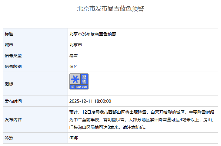 预计,12日凌晨北京市西部山区将出现降雪,白天开始影响城区,主要降雪时段为中午至前半夜,有明显积雪。大部分地区累计降雪量可达4毫米以上,房山、门头沟山区局地可达8毫米,请注意防范。