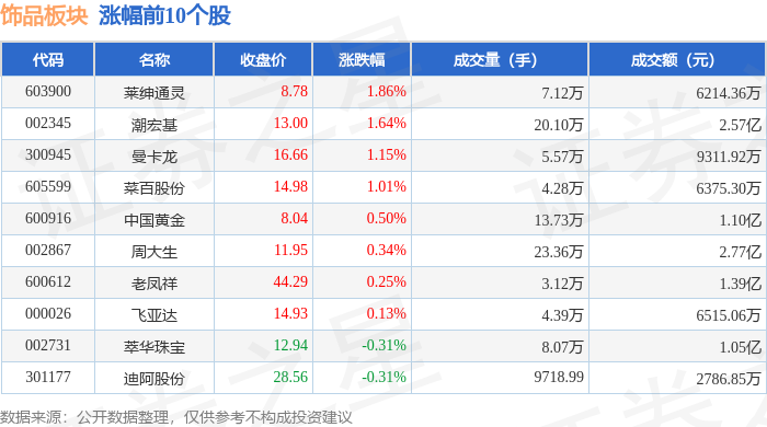 从资金流向上来看,当日饰品板块主力资金净流出4279.73万元,游资资金净流出5184.08万元,散户资金净流入9463.82万元。饰品板块个股资金流向见下表: