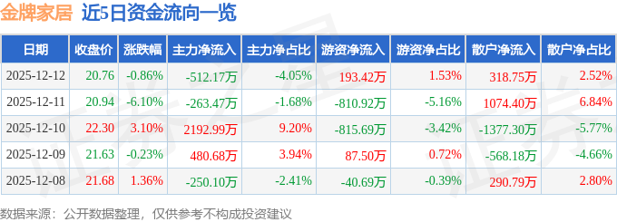 证券之星消息,截至2025年12月12日收盘,金牌家居(603180)报收于20.76元,下跌0.86%,换手率3.87%,成交量5.97万手,成交额1.26亿元。