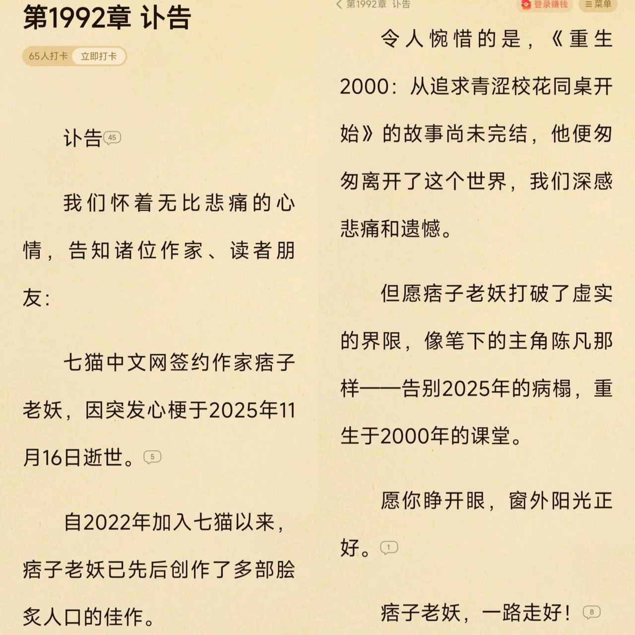近日,多位网文博主发文称,七猫中文网签约作家“痞子老妖”于2025年11月16日因突发心梗离世。