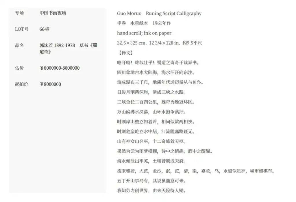 郭沫若书法作品《蜀道奇》800万元起拍!女儿:作品遗失后曾报案,要求拍卖公司返还