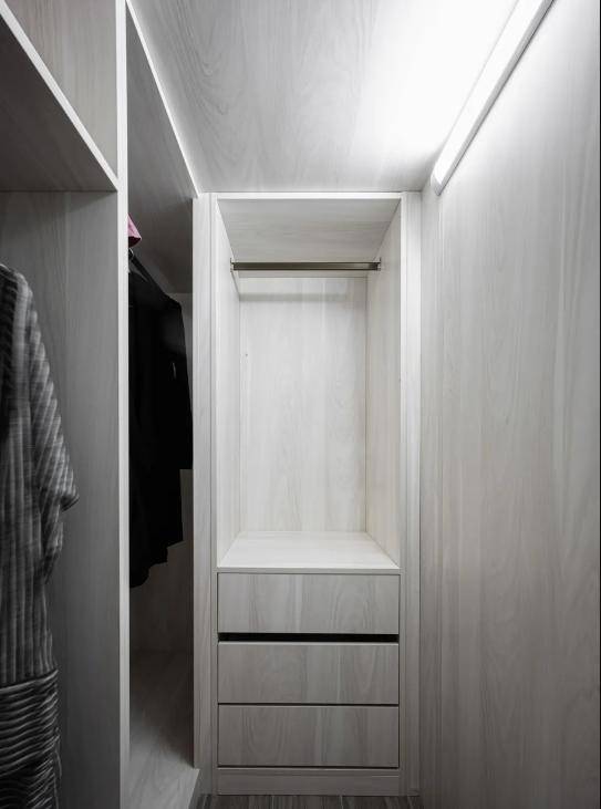 烘干机解决衣物晾晒,解放阳台,并设在临近衣帽间处,烘干后的衣服可直接放置在开放式短挂衣区台面上进行叠衣,且高度设计合理。