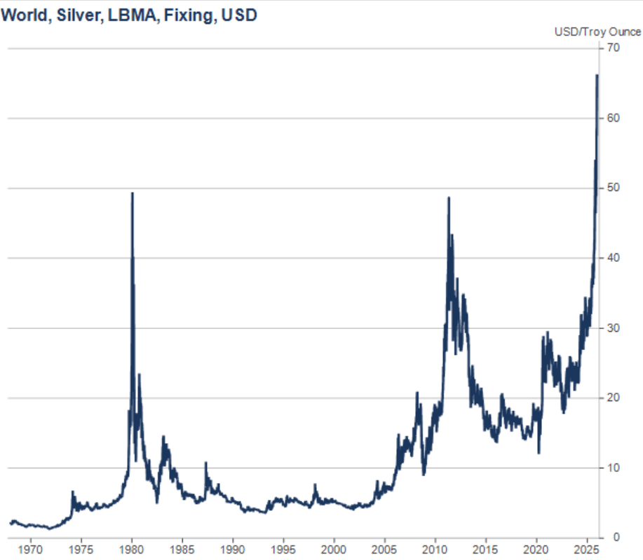 当时,芝加哥商品交易所(CME)在九天内连续五次上调白银保证金要求。这一举措迫使期货市场大规模去杠杆,导致白银价格在几周内暴跌近30%。虽然实物需求并未消失,但杠杆资金的撤退足以摧毁价格。随后,随着QE2结束和实际利率回升,白银进入了漫长的熊市。
