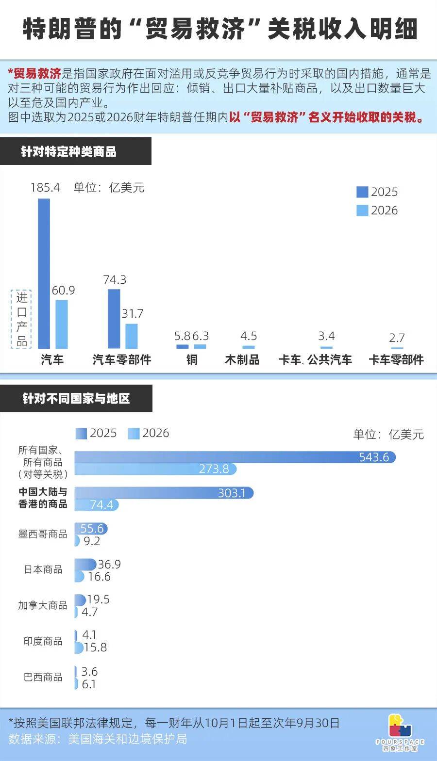 根据美国海关数据,特朗普上任后,针对特定商品的“贸易救济”关税中进账最多的是进口汽车的税收,2025财年至今共进账246.3亿美元。而特朗普力推的“对等关税”则赚进了超800亿美元。