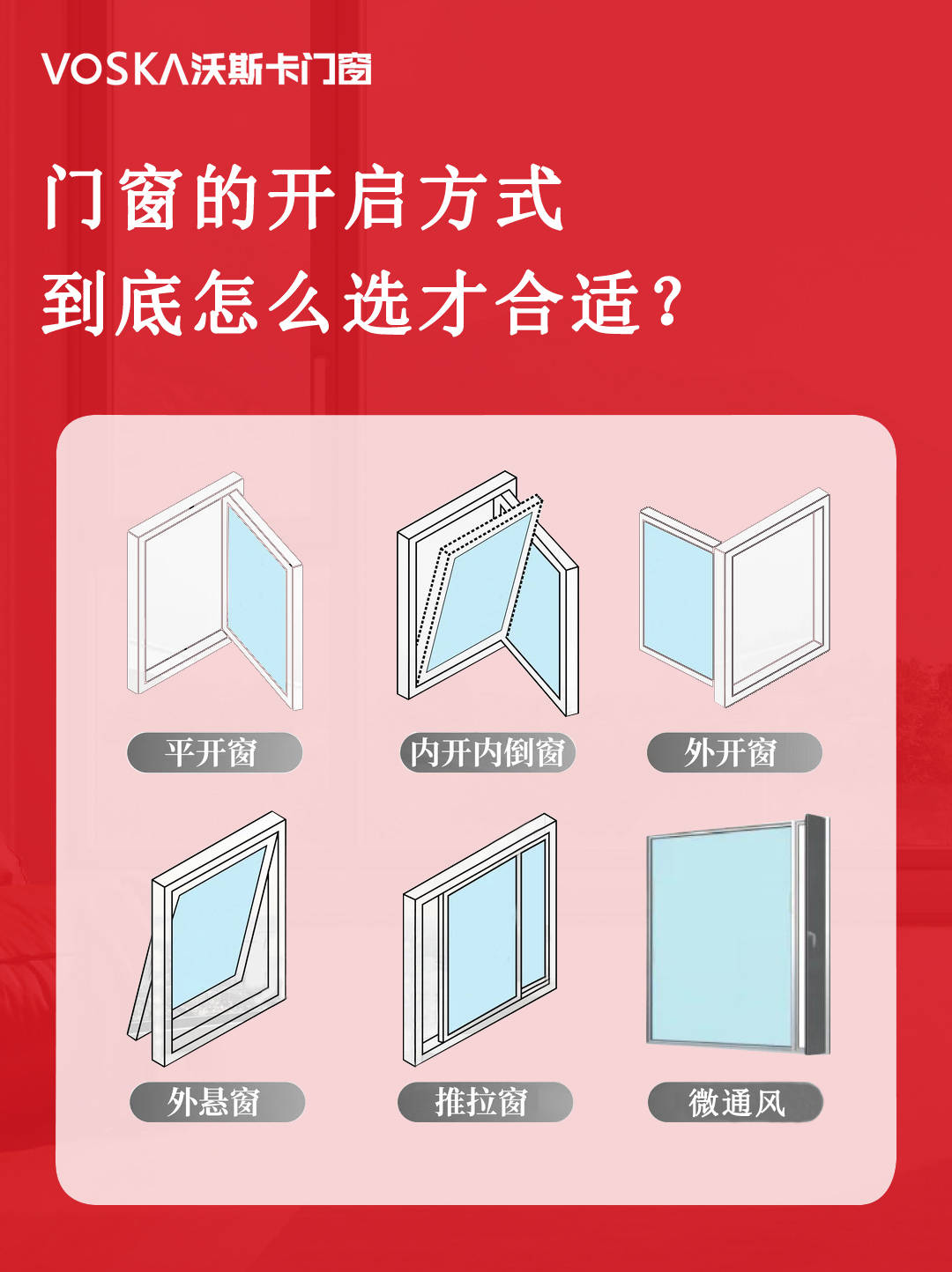 总而言之,门窗开启方式没有绝对的优劣之分,只有是否适配的差异。结合空间功能、居住需求与安全考量,再选择像沃斯卡门窗这样品质过硬、品类齐全的品牌,就能选到最适合自己的门窗,让家居生活更舒适、更安心。