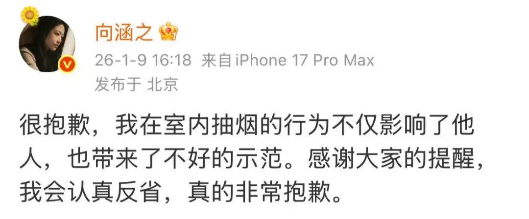 1月9日下午,演员向涵之通过微博账号道歉:很抱歉,我在室内抽烟的行为不仅影响了他人,也带来了不好的示范。感谢大家的提醒,我会认真反省,真的非常抱歉。