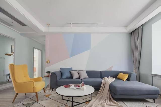 沙发背景墙上是做了几何拼色的设计,简洁而又显得更有活力。L型的蓝灰色布艺沙发,给人一种慵懒惬意的感觉,躺在上面肯定很舒服。