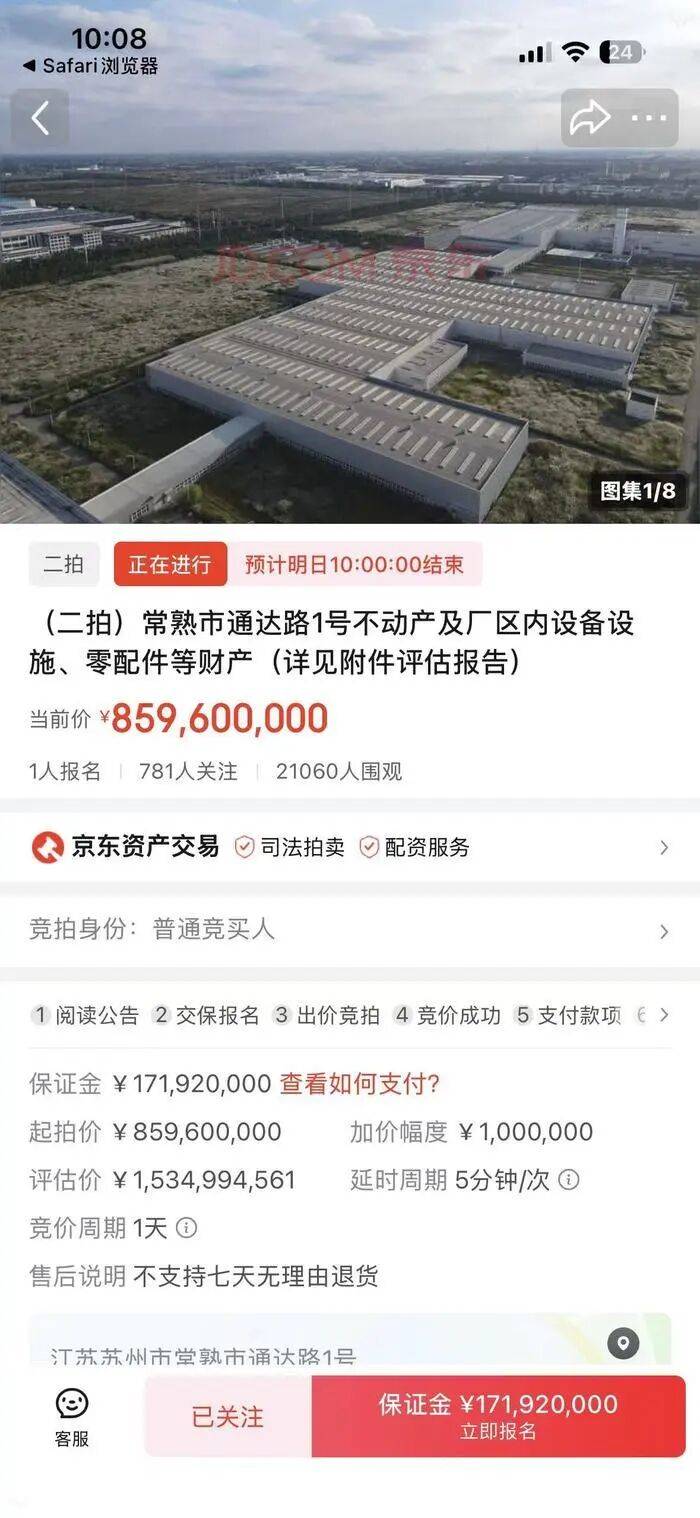截至15日上午,该标的拍卖状态已显示为“正在进行”,意味着常熟市人民法院未因举报中止执行程序。本次二拍起拍价定为8.596亿元,仅为评估价15.35亿元的约56%,竞价周期为一天。此前,该资产曾于2025年12月29日以10.745亿元起拍,但最终因无人出价而流拍。