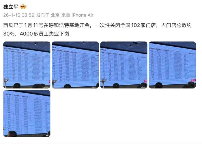 当日上午,一份名为“初步沟通闭店102家门店”的内部清单在网络流传。大鱼财经记者将这份清单与近期全国各地的闭店潮进行交叉比对,发现多处吻合。西贝创始人贾国龙在随后的回应中,直接引用了包含该清单的微博截图,并确认“截图信息基本准确”。