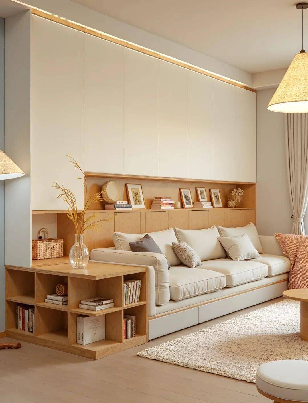 如果你是读书爱好者,有较多的储物、藏书需求,我推荐你可以在沙发背面做满墙的薄柜,收纳能力直接拉满,如果还想再多一些收纳空间,再搭配一个活动小推车就足够了。