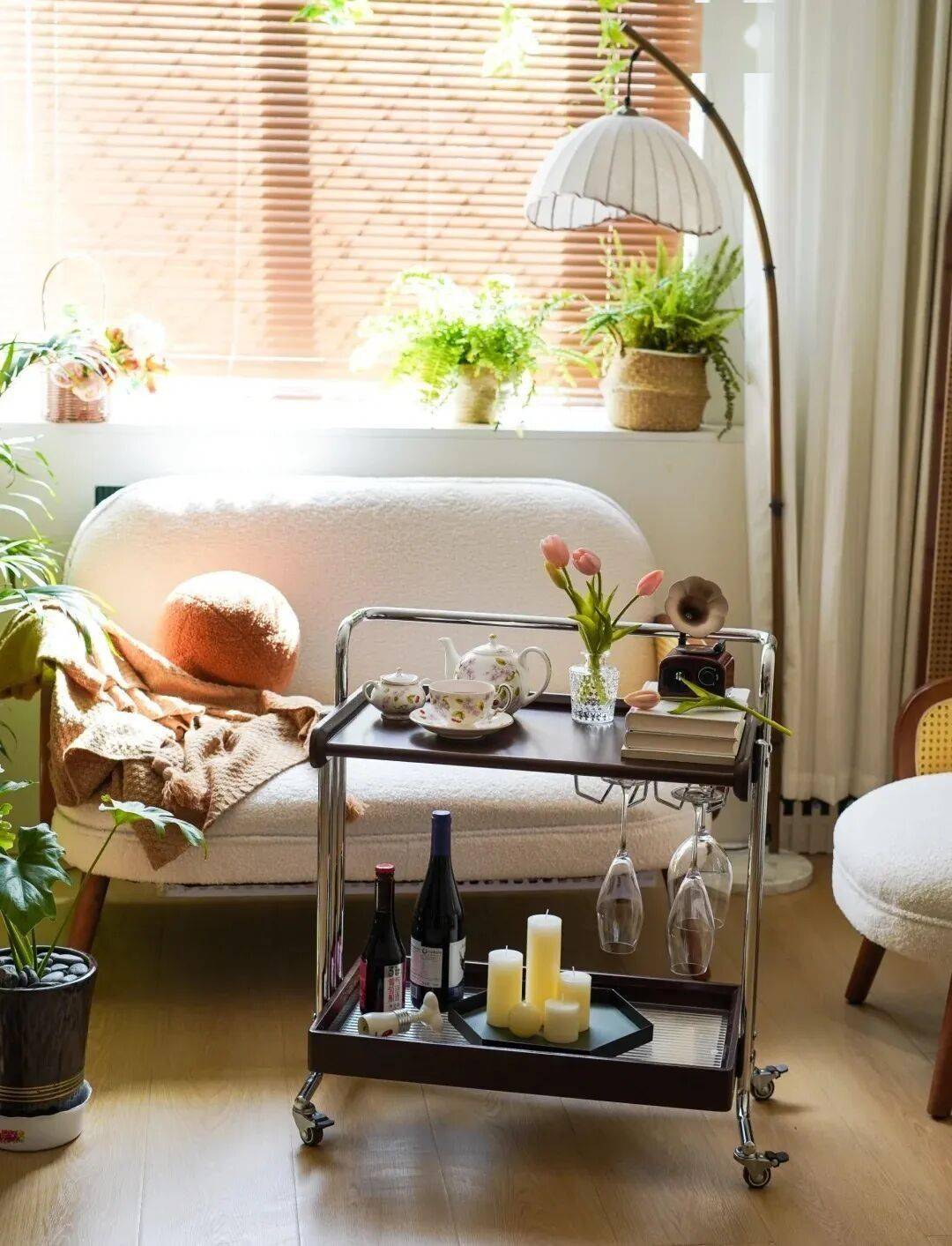 把传统只能固定摆放的大茶几,换成带轮子的小推车,喝茶、吃零食的时候拉过来当作茶台,吃饭、吃火锅的时候变成餐车,如果是看书、工作的时候还能当作移动书架,简直就是空间利用的高手,比固定茶几好用多了。