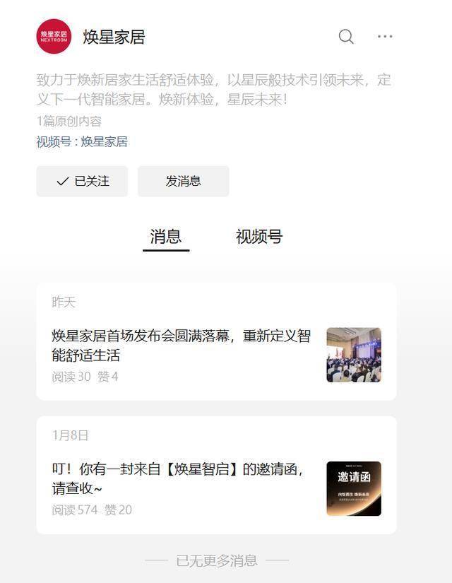 焕星家居同名的微信公众号于2026年1月8日开始更新,目前已发布两篇内容。