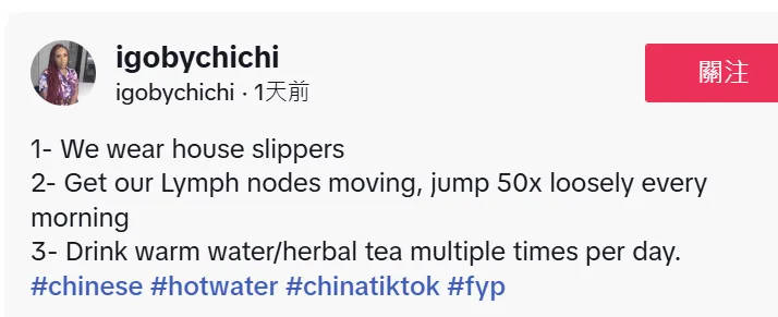 华裔博主雪莉的视频成了这场风潮的起点。她在视频中将冷幽默与文化洞察相结合,向粉丝介绍冬季养生、中医理念和华人饮食习惯:喝热水、在家穿拖鞋、农历2月17日是马年……