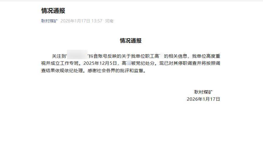 连日来,河南三门峡的牛女士在社交平台发布向出轨丈夫高某“道歉”的视频,引发热议。极目新闻记者注意到,17日中午,该女子依旧更新了第六天的道歉视频,其粉丝数较昨日上涨超20万。当天下午,其丈夫工作单位耿村煤矿发布通报,高度重视并成立工作专班。2025年年底,高某曾受到党纪处分。现已对其停职调查并将按照调查结果依规依纪处理。