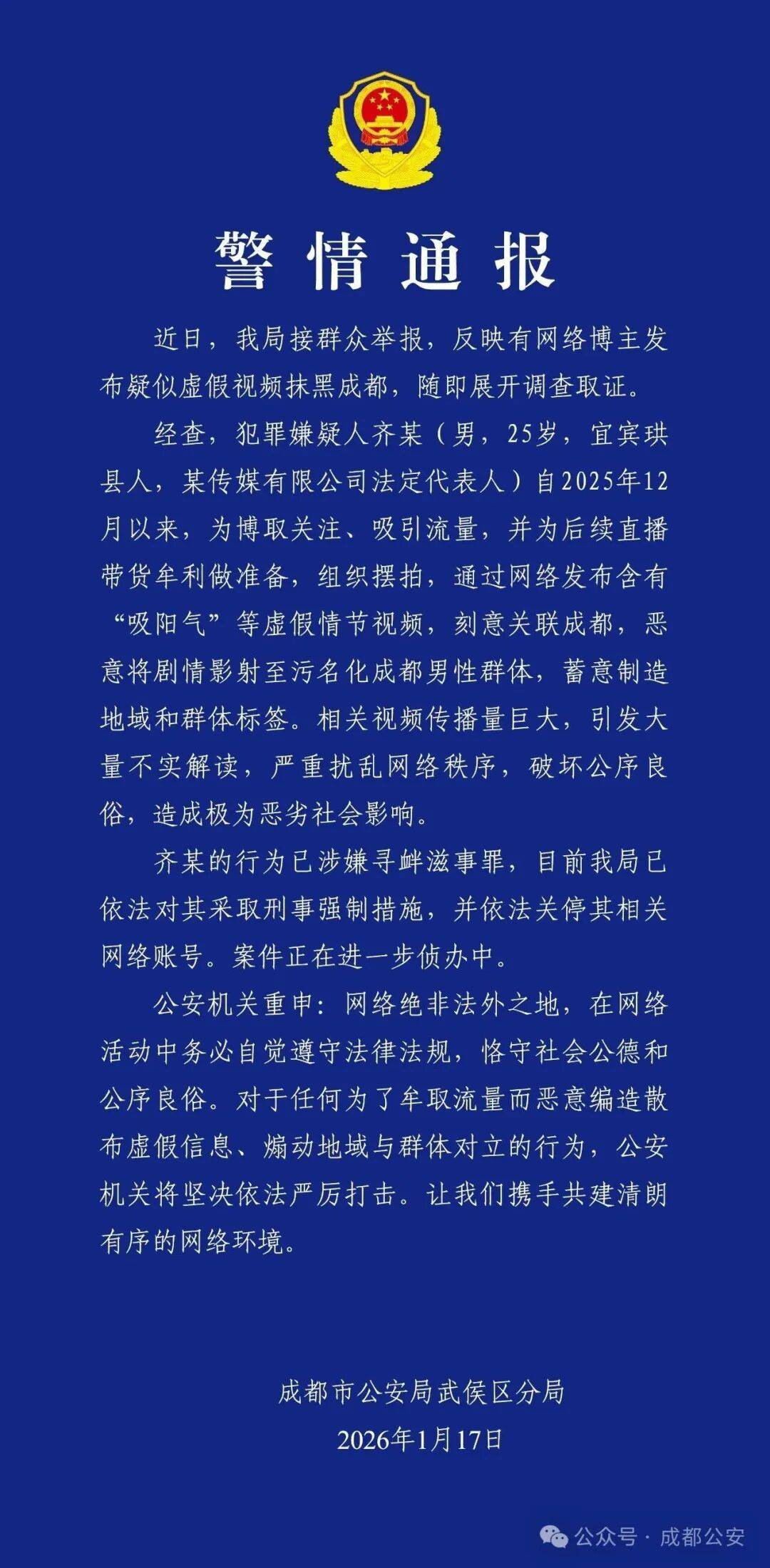 经查,犯罪嫌疑人齐某(男,25岁,四川省宜宾珙县人,某传媒有限公司法定代表人)自2025年12月以来,为博取关注、吸引流量,并为后续直播带货牟利做准备,组织摆拍,通过网络发布含有“吸阳气”等虚假情节视频,刻意关联成都,恶意将剧情影射至污名化成都男性群体,蓄意制造地域和群体标签。相关视频传播量巨大,引发大量不实解读,严重扰乱网络秩序,破坏公序良俗,造成极为恶劣社会影响。