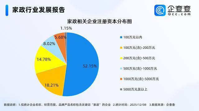 企查查数据显示,截至12月8日,国内现存家政相关企业291.05万家。注册量方面,近十年相关企业注册量呈上下波动态势,2024年全年注册54.55万家相关企业。截至目前,今年已注册46.86万家相关企业。存量方面,从经营时间来看,近半数家政相关现存企业成立于近三年,其中,成立年限在1-3年的相关企业最多,占比29.60%。从注册资本来看,超半数家政相关企业的注册资本在100万元以内,占比达52.15%。从地区分布来看,现存家政相关企业主要集中分布在华东地区,占比达38.17%。