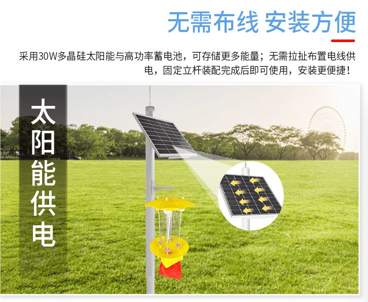 在农田害虫防治中,物理防控方法受到越来越多关注。太阳能杀虫灯利用害虫的趋光特性,通过特定波长的光源吸引害虫,并通过高压电网或撞击等方式灭杀。其能源来自太阳能电池板,无需外接电源,适合在田间布设。
