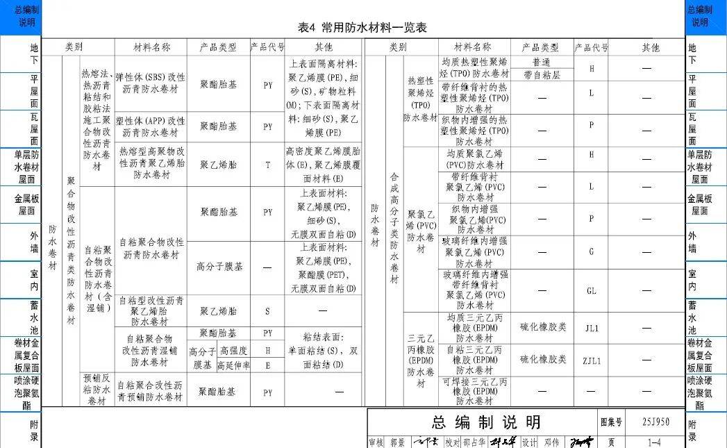 最实用的当属表4-常用防水材料一览表,它按国标分类,细化了各类防水材料的类型、品种、名称和代号,就像一本 “防水材料家谱”,让使用者清晰了解各类材料的 “家庭成员” 及相互关系,轻松告别防水技术小白身份。