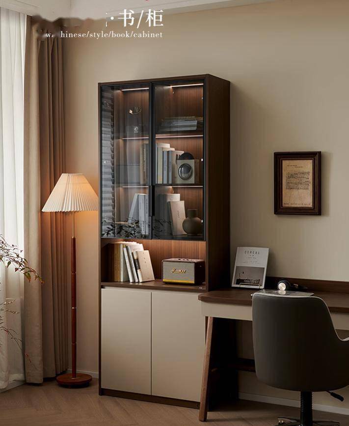 深色木质纹理与玻璃门的搭配,既保留了中式的沉稳大气,又通过玻璃的通透感减轻了体量感,增添了几分时尚与轻盈。150cm以上的落地式设计大气稳重,提供充足的收纳空间。平开式的玻璃柜门方便取物,密封性好。这款书柜能轻松营造出一个宁静、有文化底蕴的书房空间,适合喜爱中式韵味但追求简约、不爱厚重感的消费者,为家居注入一份东方的静谧与雅致。